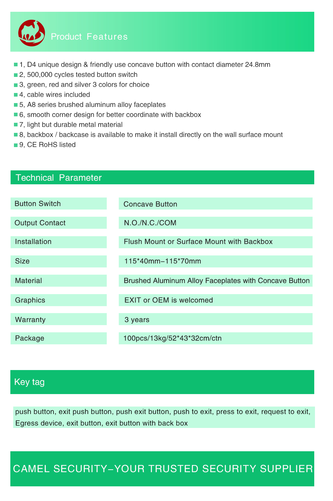 Exit Button Specialists Camel Security offer a wide range of market leading access control door exit buttons and door release buttons. Our products covers push to exit button, press to exit button, Infrared sensor No touch exit button, touch sensor exit and keyswitch.